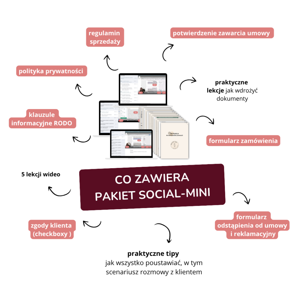Jest to zarówno lekcja wideo jak wypełnić każdy dokument w pakiecie, a także praktyczne lekcje jak ustawić istotne z prawnego punktu widzenia elementy (np. jak prezentować regulamin, politykę prywatności, zawierać umowę realizując obowiązki informacyjne i odbierając niezbędne zgody - w tym scenariusz rozmowy w tzw. wiadomości prywatnej i udostępniania formularza zamówienia). Nie musisz nic szukać, pokażę Ci co i jak.